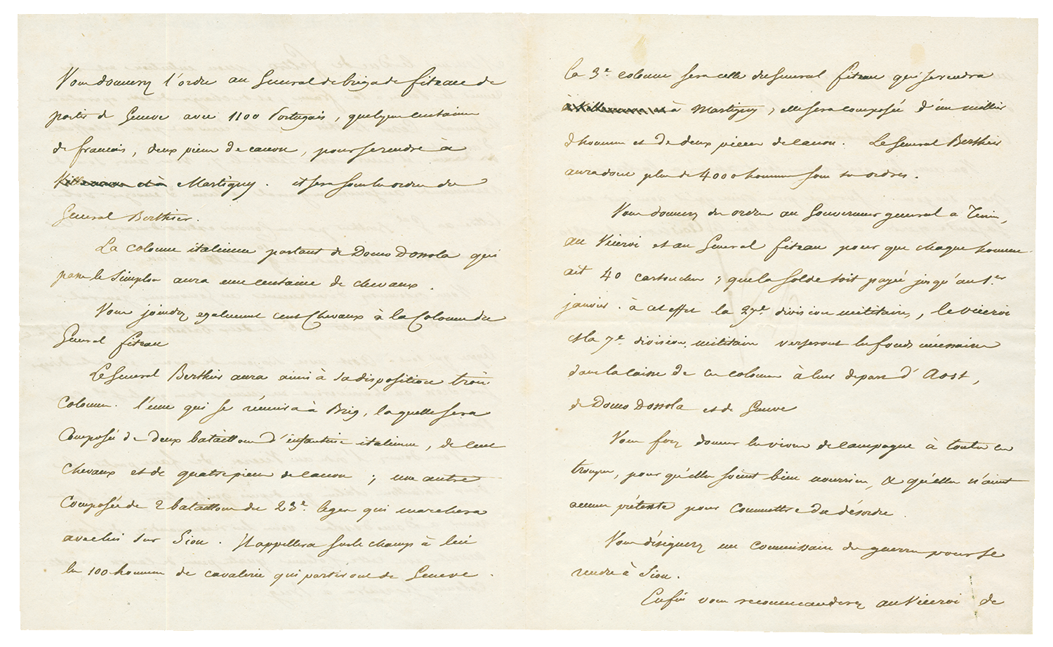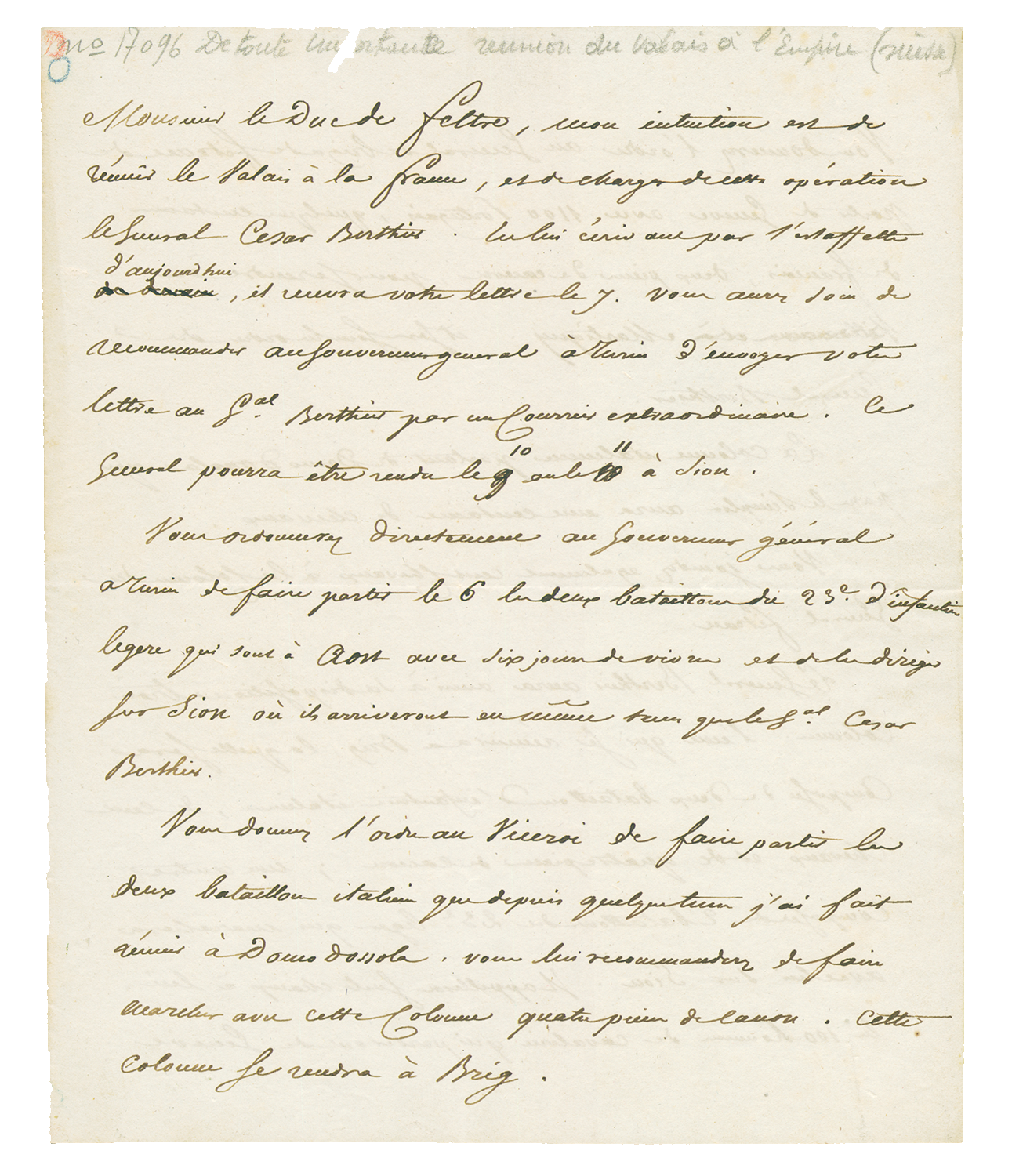 La lettre débute par ces mots: "Monsieur le Duc de Feltre, mon intention est de réunir le Valais à la France, et de charger de cette opération le Général César Berthier". La lettre contient des détails d'organisation de l'opération: itinéraires, troupes à engager, équipement, armement, solde et vivres. Les différents généraux devront envoyer en Valais, de manière coordonnée, des troupes stationnées à Aoste, par le Grand-St-Bernard, à Domodossola, par le Simplon, et à Genève, par le Chablais.
