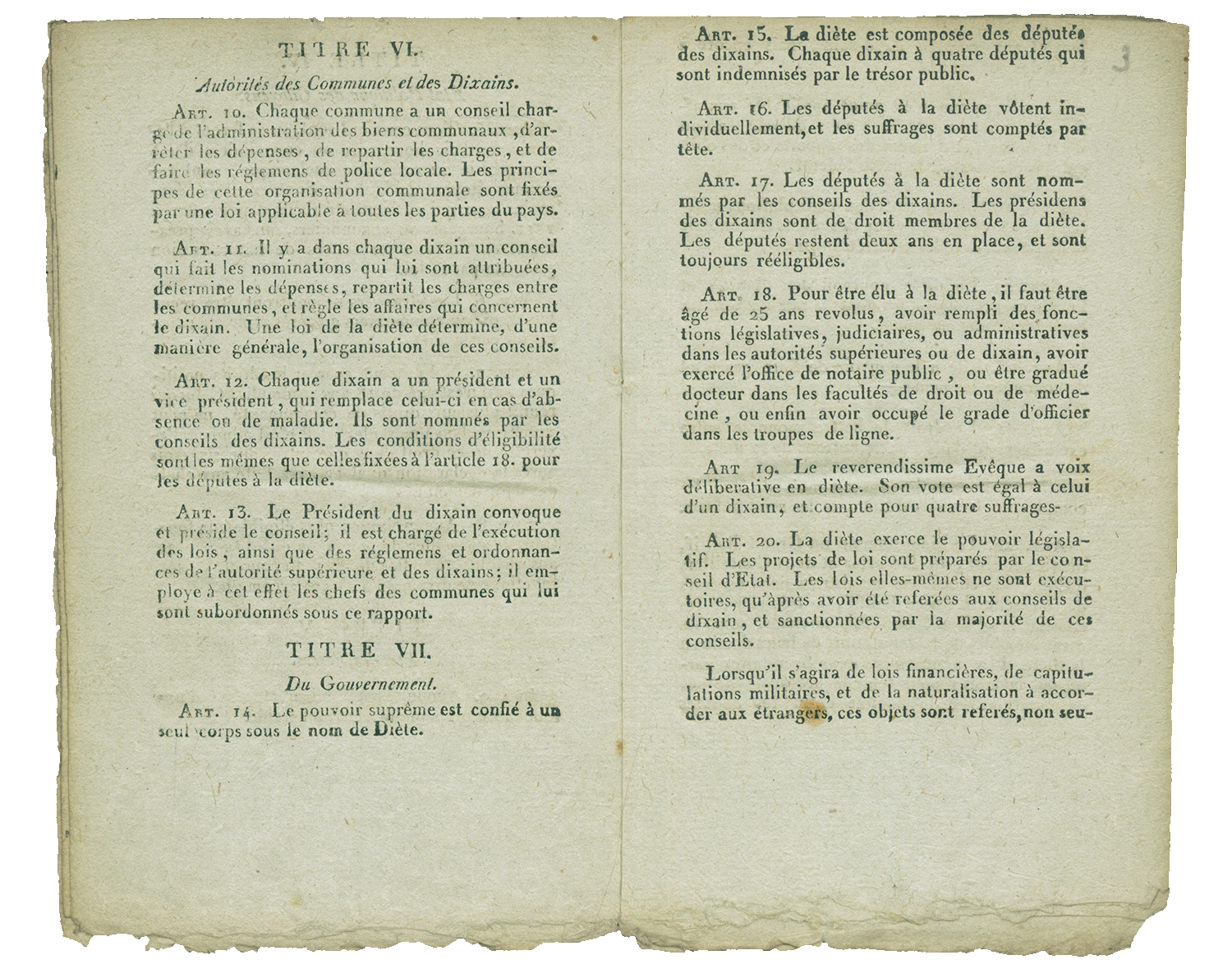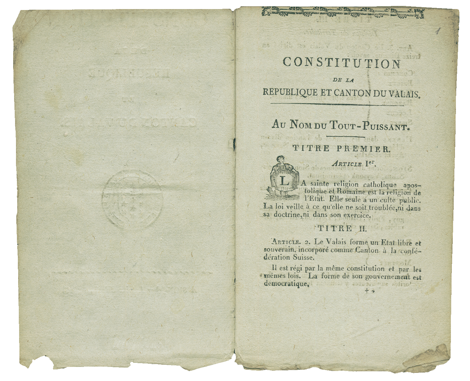 Art. 1. La Republique du Valais est reçue dans la Confédération suisse en qualité de Canton. Elle prend rang après le Canton de Vaud et est le vingtième des Etats de la Suisse.