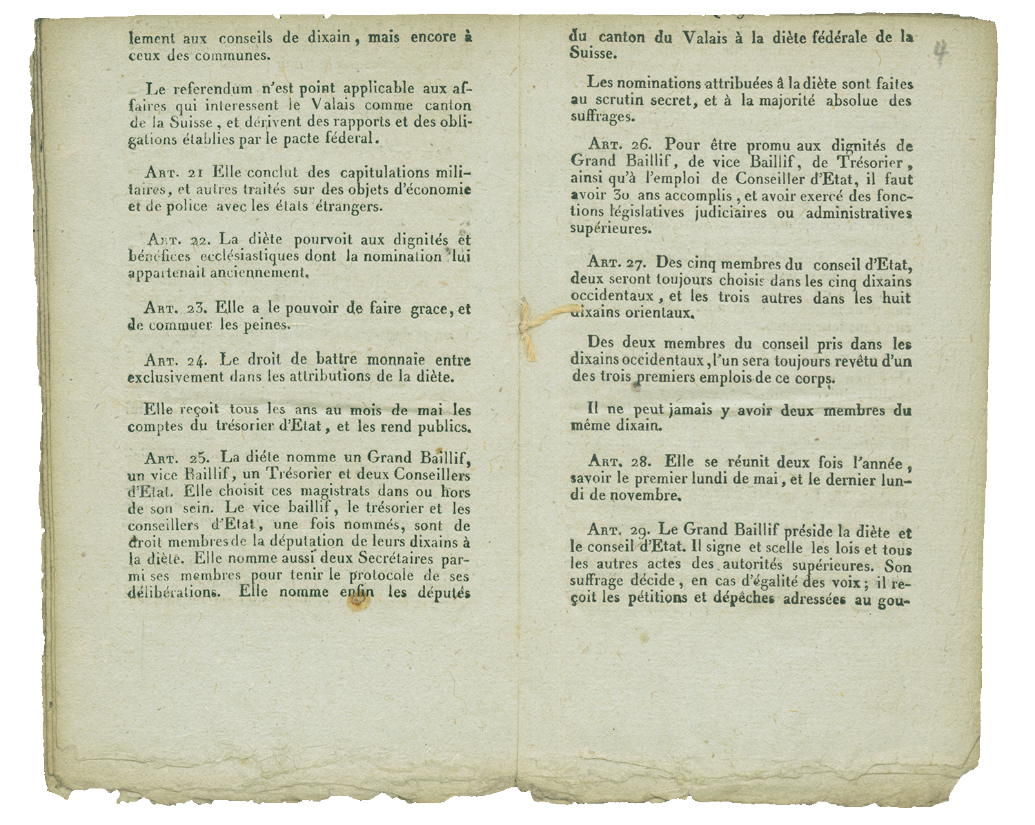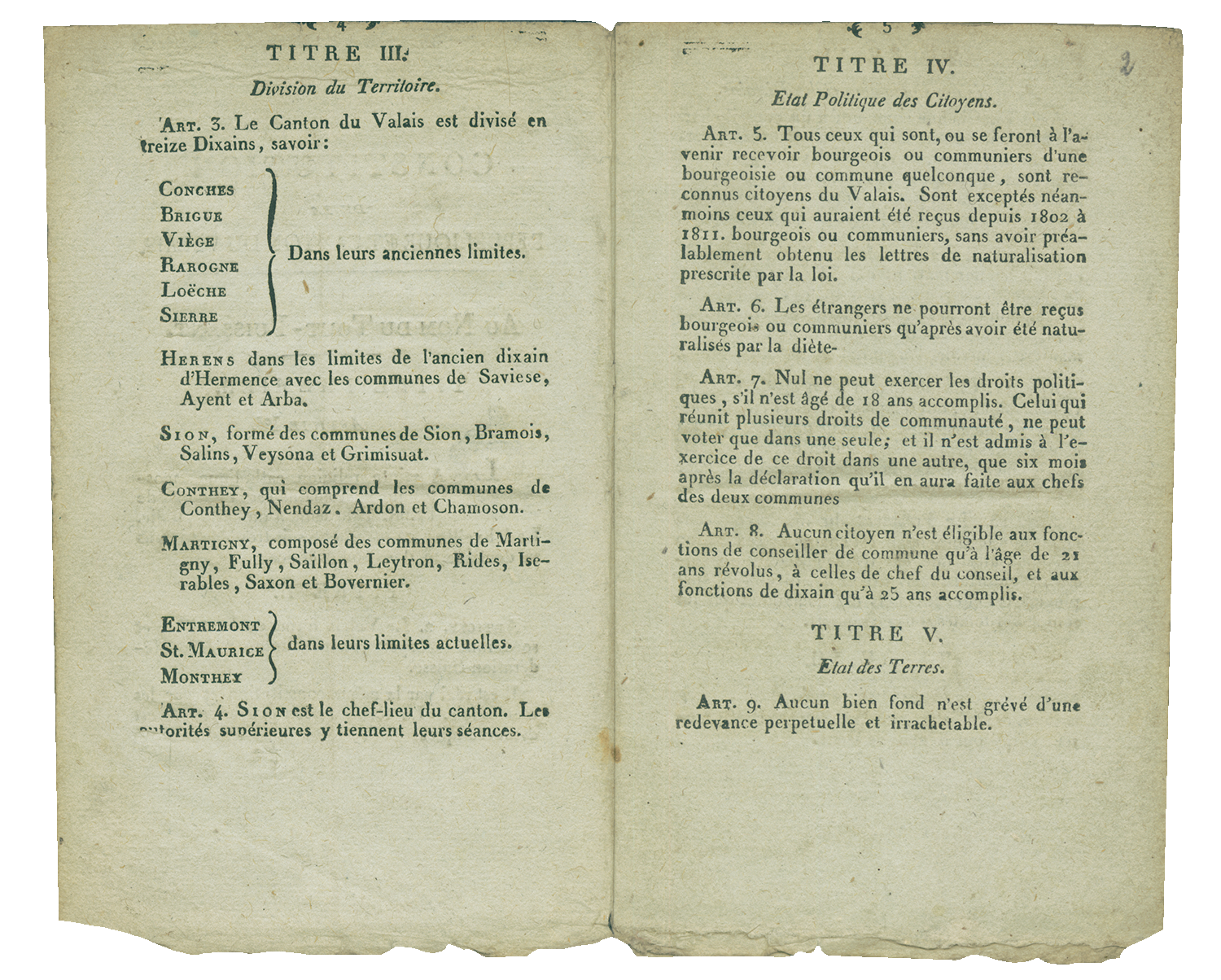 Art. 4. La Confédération suisse, ayant égard à la situation économique peu aisée du peuple du Valais et aux maux qui ont pesé sur lui en 1798 et dès lors, consent à régler son contingent [p. 3] en argent à un taux moyen entre ceux des Cantons de la première et de la seconde classe et à le fixer à neuf mille six cent francs de Suisse. Par cette disposition et par celle de l'article précédent, il n'est toutefois pas préjugé à la révision des contingens reservée par l'article 3 du pacte fédéral.