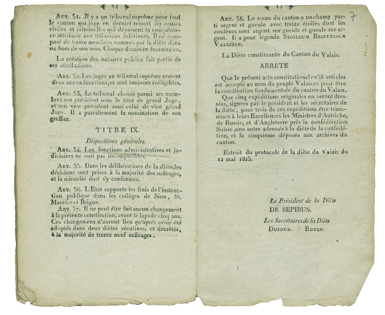 Les fondés de pouvoirs respectifs, savoir au nom de la Diète de la Confédération suisse, Messieurs Fréderic de Mulinen, avoyer de la Ville et République de Berne et député de cet Etat à la Diète suisse, et Vincent de Ruttimann, avoyer de la Ville et République de Lucerne et député de cet Etat à la Diète suisse, et, au nom de la République du Valais, Messieurs le Baron Gaspard Eugène de Stockalper, ancien Grand Baillif, et Michel Dufour, ancien Conseiller d'Etat, Grand Juge actuel au Tribunal Suprême; ont conclu et signé l'acte [p.2] de réunion dont la teneur suit: