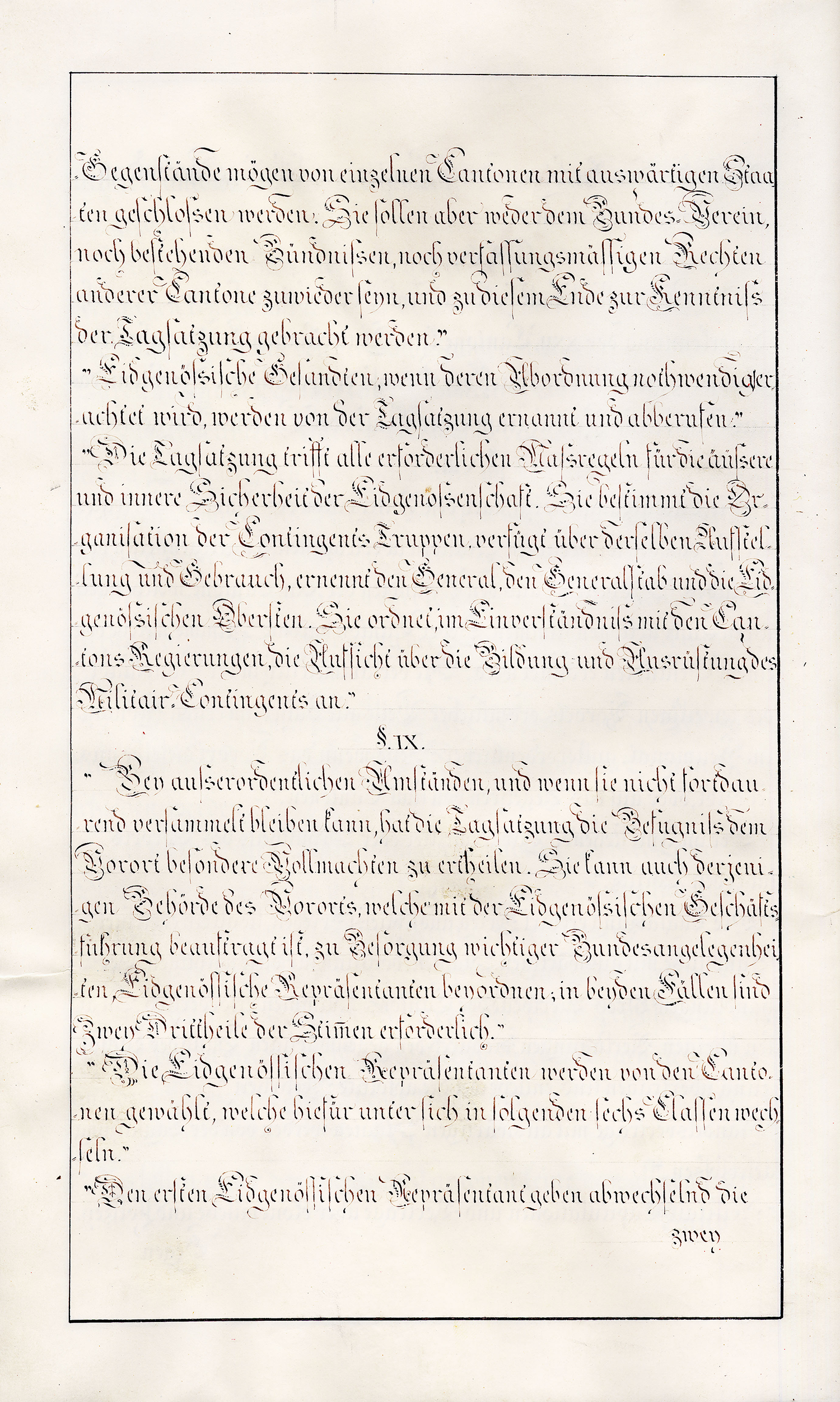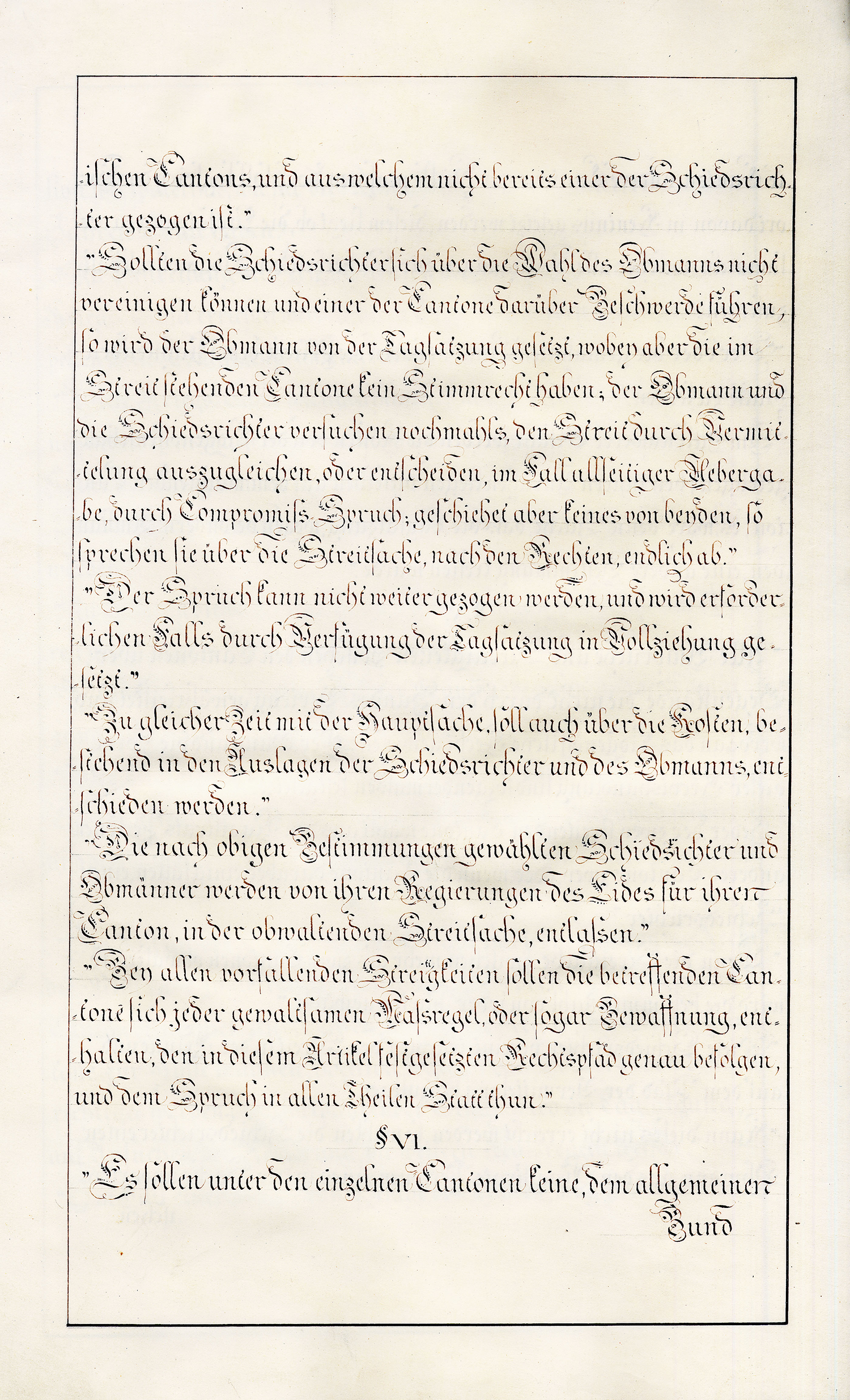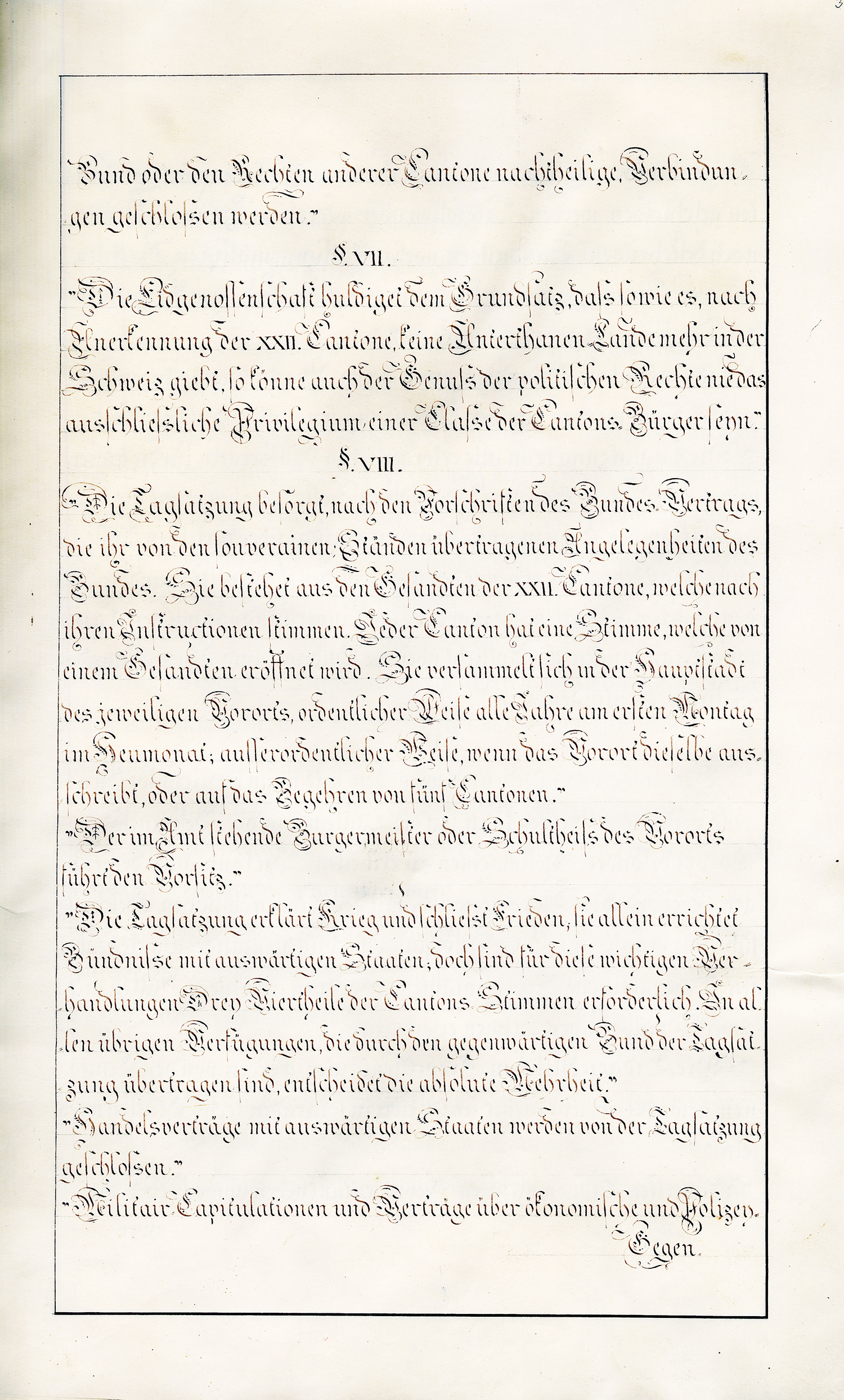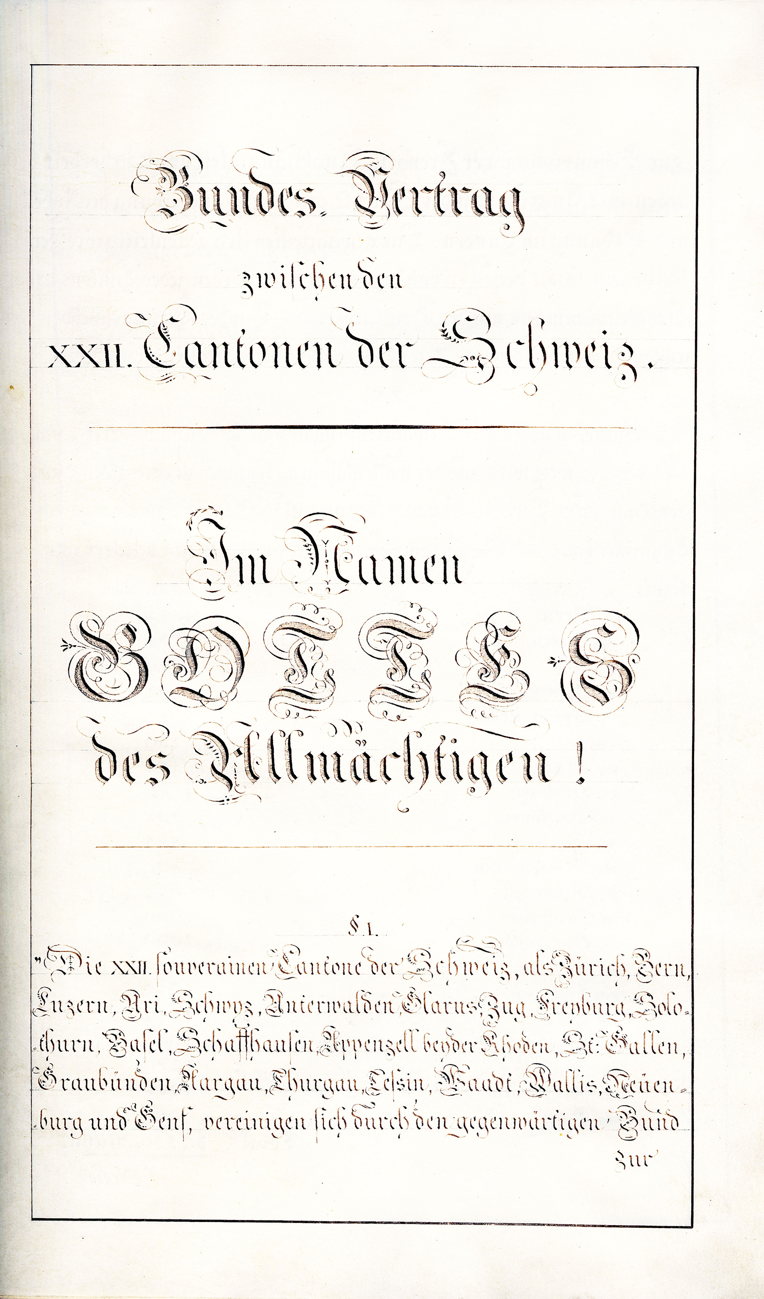so haben die beydseitigen Bevollmächtigten, nämlich im Namen der Tagsatzung der Schweitzerischen Eidgenossenschaft die Hochgeachteten Herren Friederich von Mülinen, Schultheiss der Stadt und Republick Bern und Gesandter dieses Standes auf der gemeineydgenössischen Tagsatzung, und Vinzenz von Rüttimann, Schultheiss der Stadt und Republick Luzern und Gesandter dieses Standes auf der gemeineydgenössischen Tagsatzung, und im Namen der Republick Wallis die Hochgeachteten Herren Baron Caspar Eugen von Stockalper, gewesener Landes-Hauptmann, und Michael Dufour, gewesener Staats-Rath und wirklicher Gross-Richter beym obersten Gericht, denjenigen Vereinigungs-Akt [S. 2] abgeschlossen und unterzeichnet, dessen Inhalt hier folgt: