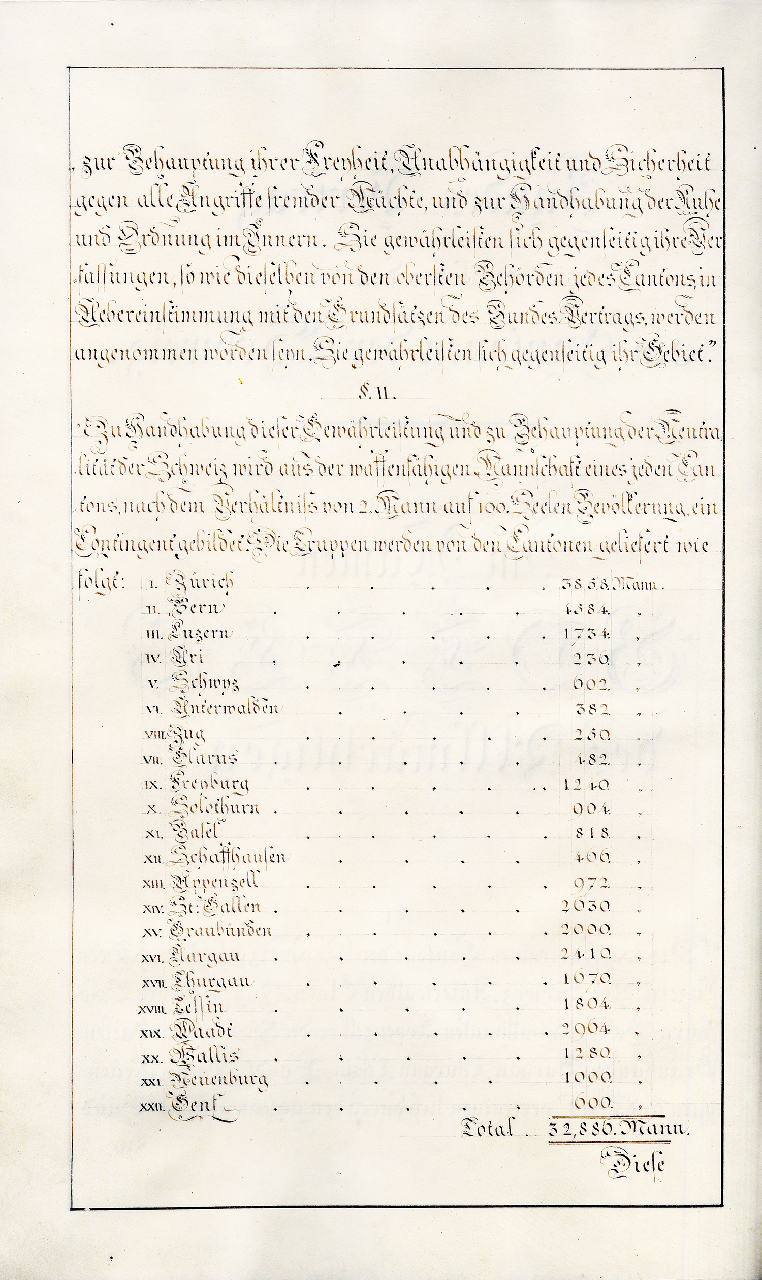 Art. 3. Er stellt sein Contingent zur Eidgenössischen Armee in dem für alle übrigen Stände angenommenen Verhältniss von zwey Mann auf hundert Seelen der ganzen Bevölkerung, nach welchem Maassstab auf vier und sechszig tausend Seelen das Contingent zwölf hundert und achtzig Mann betragen soll.