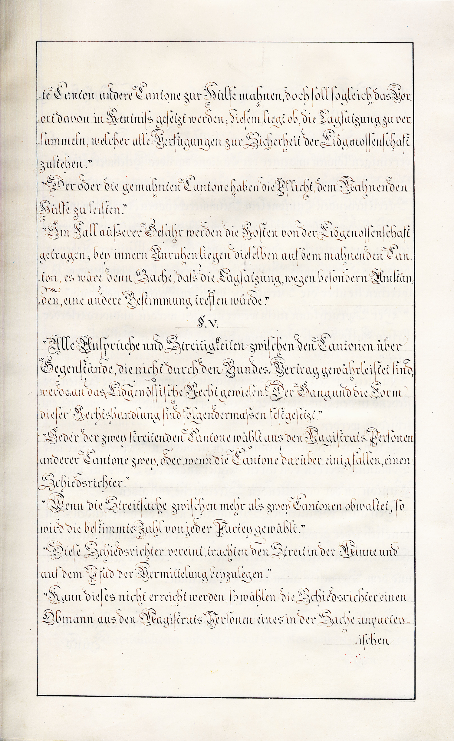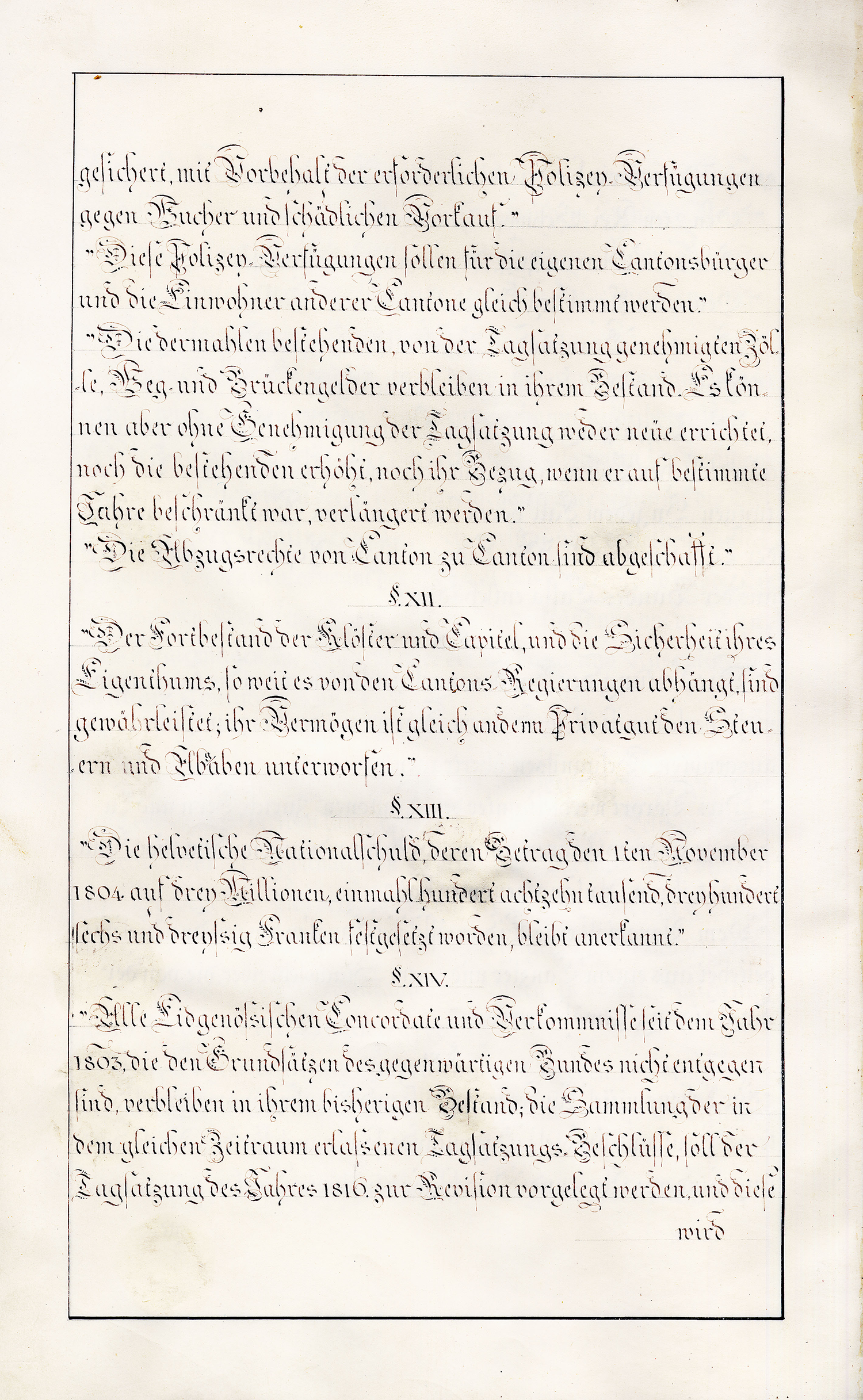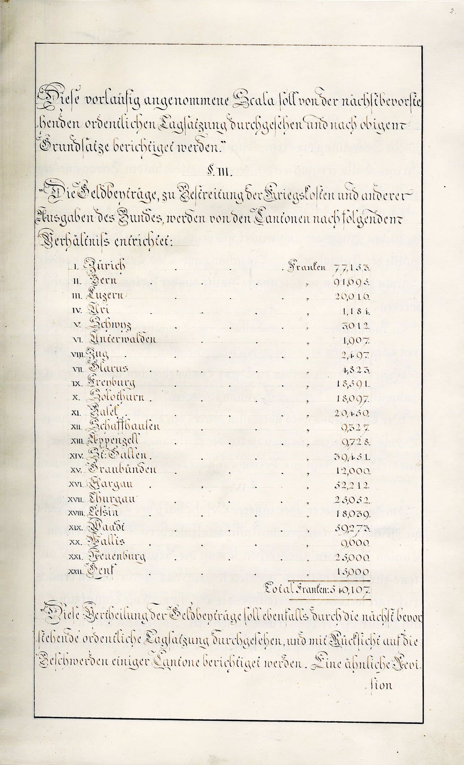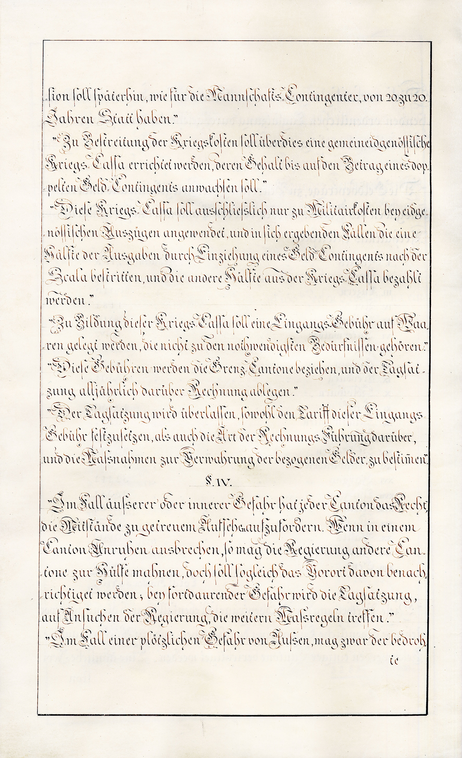 Art. 4. In Rücksicht der beschränkten œcconomischen Lage des Walliser-Volkes und des vielfachen Unglücks, welches im Jahr 1798 und seither dasselbe betroffen hat, willigt die Schweitzerische Eidgenossenschaft ein [S. 3], dass sein Geldcontingent nach einem Mittel-Fuss zwischen den Cantonen erster und zweyter Classe berechnet und auf neun tausend sechs hundert Schweitzer Franken bestimmt werde. Durch diese Bestimmung und durch jene im vorhergehenden Artickel soll indess der durch den 3ten Artikel des Bundes-Vertrags vorbehaltenen Revision der Beyträge an Mannschaft und Geld nicht vorgegriffen seyn.