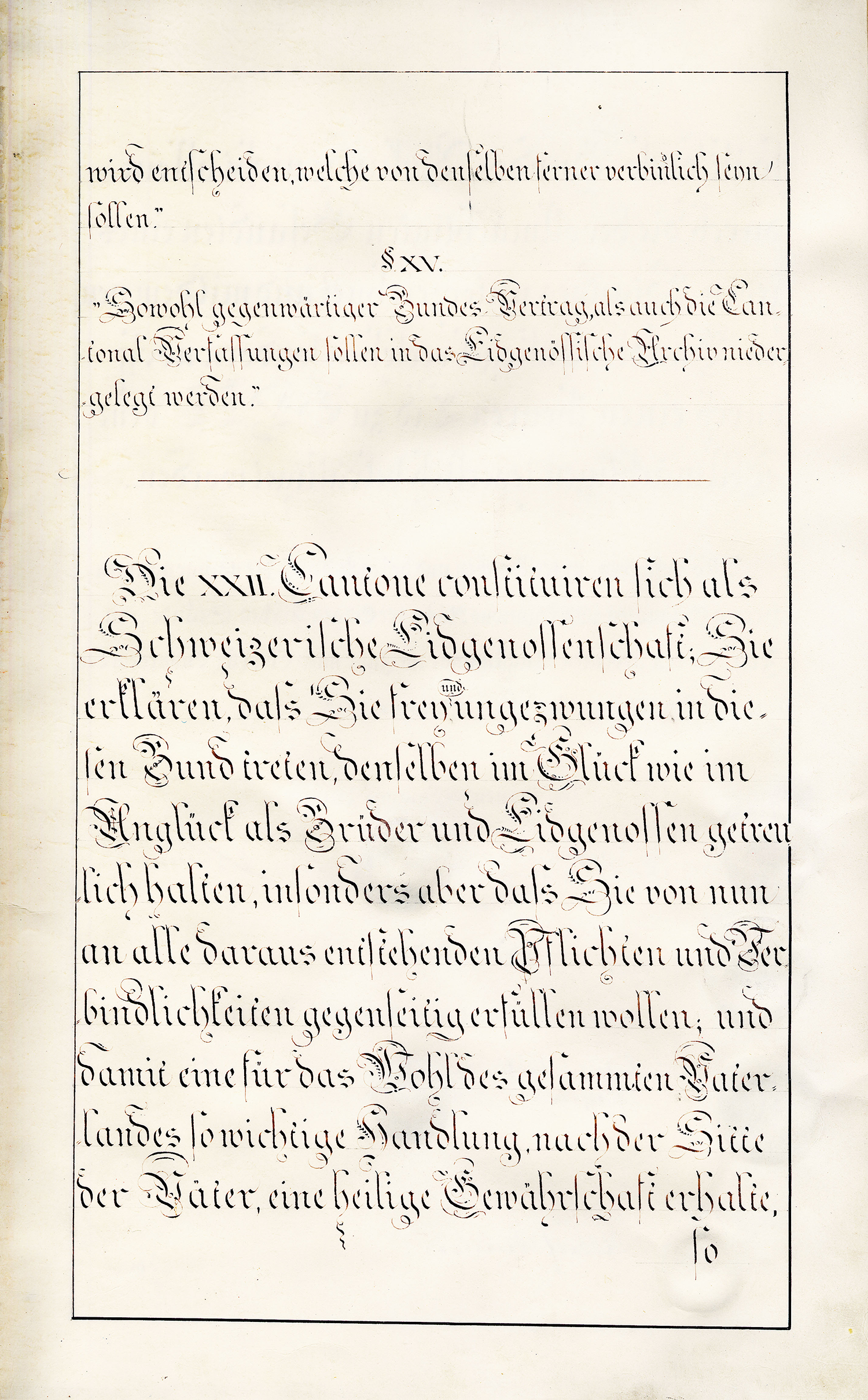 Art. 1. Die Republick Wallis wird als Canton in die Schweitzerische Eidgenossenschaft aufgenommen. Sie nimmt ihren Rang nach dem Canton Waadt und ist der 20te Stand der Schweitz.