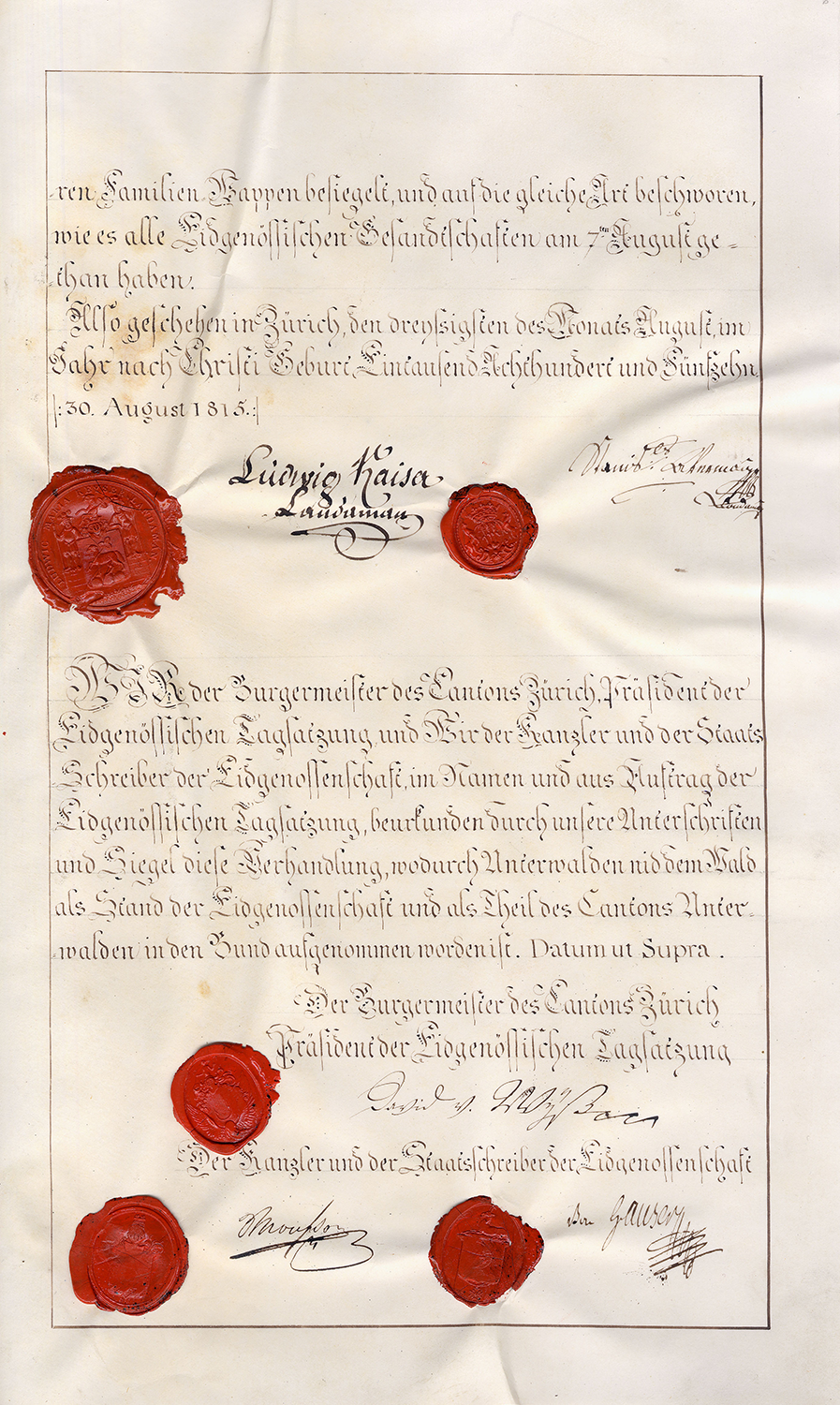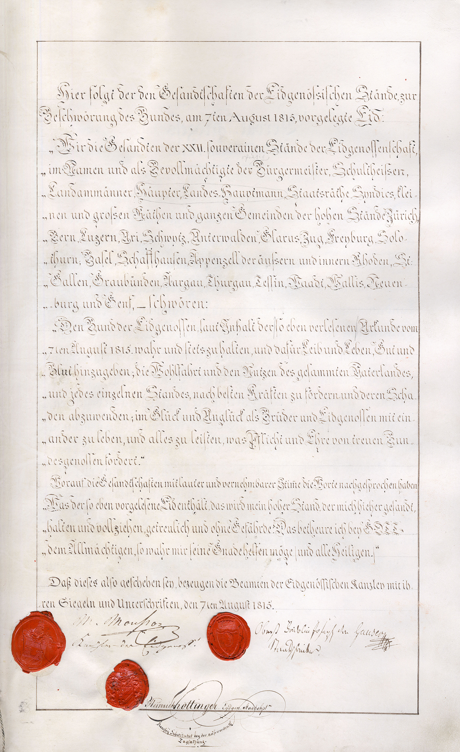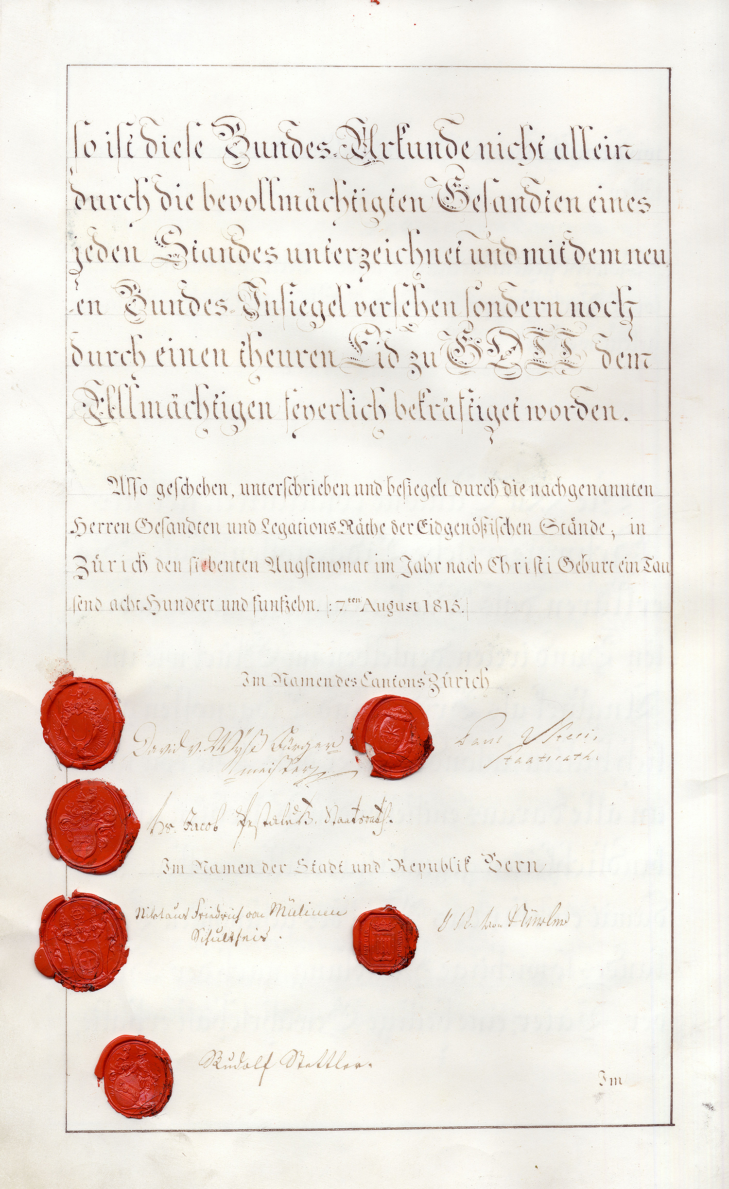 Also geschehen und unterzeichnet in Zurich den 4ten Augstmonat im Jahr ein tausend acht hundert und fünfzehn (1815).