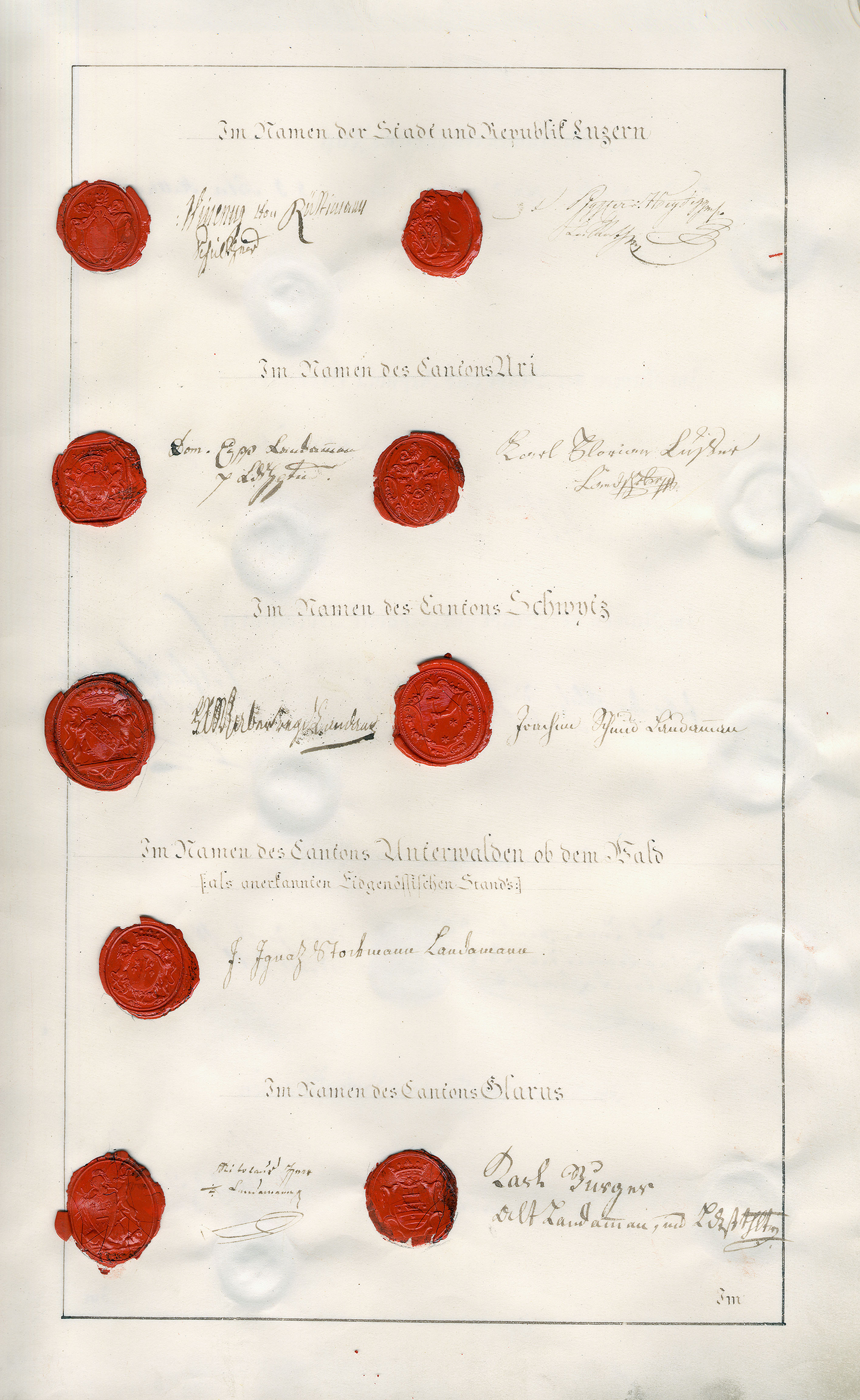 Chaque canton est représenté par des députés qui prêtent solennellement serment et qui apposent leur sceau et leur signature au bas du Pacte.