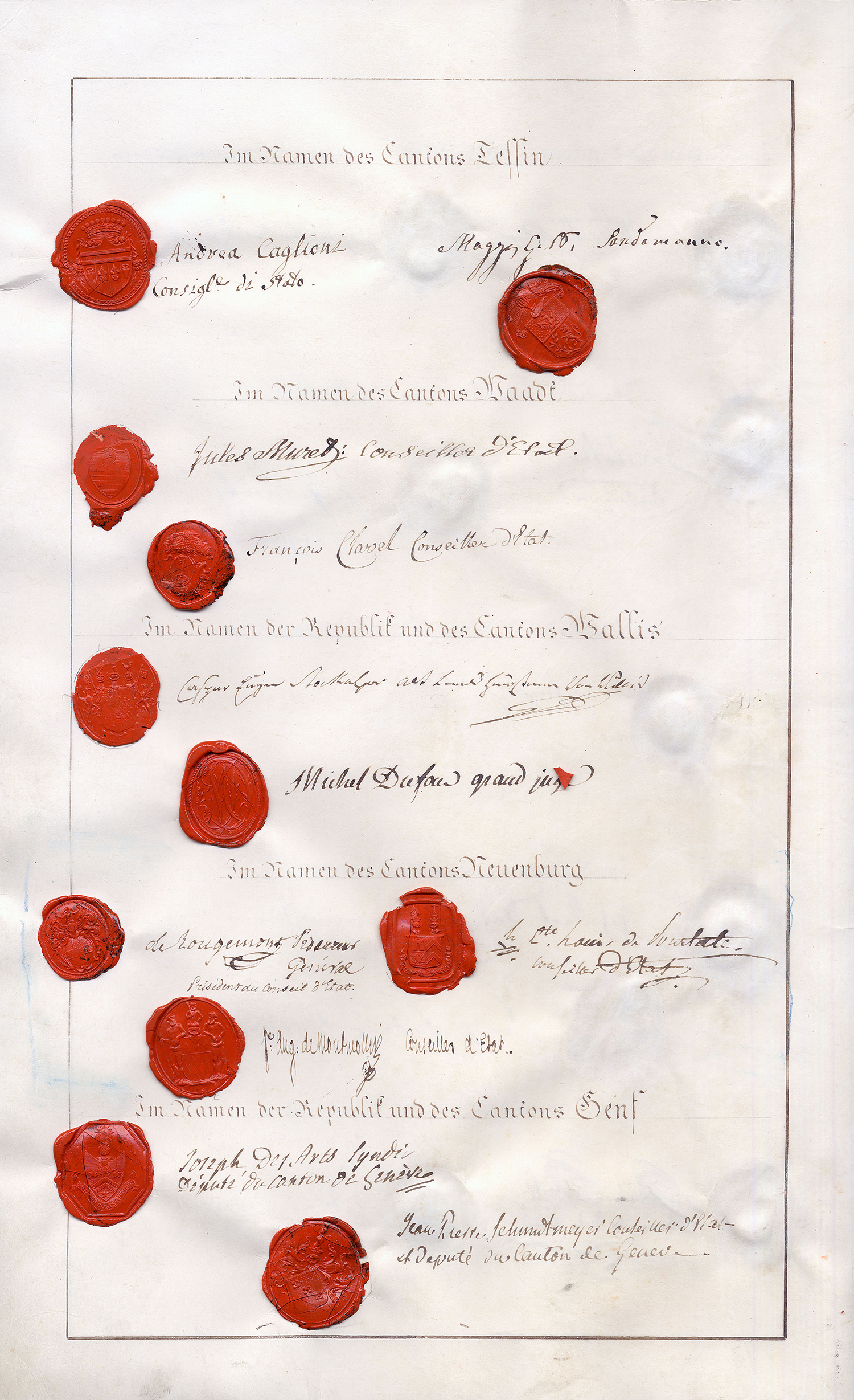 Cette version de l'acte porte la signature du président de la Diète fédérale, David von Wyss, bourgmestre de Zurich, canton directeur (Vorort) en 1815; il préside la Longue Diète de 1814-1815. On trouve également la signature de Jean-Marc Mousson, chancelier fédéral, et le sceau de la Confédération suisse (datant de 1803).