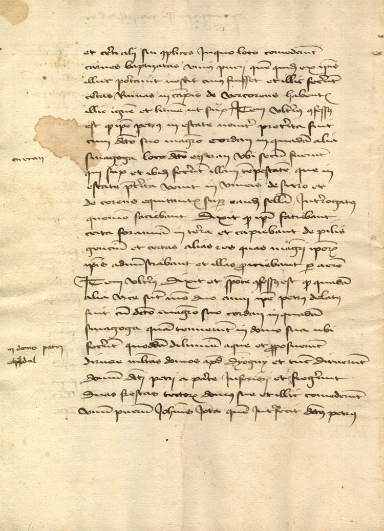 Item ulterius dixit et sponte confessus est quod quadam alia vice, sunt modo duo anni, ipse Petrus delatus fuit cum dicto magistro suo Cordan in quadam sinagoga quam tenuerunt in domo sua ubi fecerunt quoddam diluvium aque et proposuerunt diruere multas domo apud Dyogny; et tunc diruerunt domum dicti Petri a parte inferiori et fregerunt duas frestas tectorum domus sue; et illic comederunt unum puerum Johannis Jota quem interfecit dictus Petrus (Page 3) delatus; et ibidem fuerunt secum Fransa, relicta Anthonii Bonivini, et certisui complices. Interrogatus quomodo interfecit illum puerum, dixit quod intravit domum dicti Johannis Jota et illum tetigit, et statim post decessit. Qui puer fuit sepultus in cimisterio de Lens; quem desepelierunt postmodum ipse Petrus et certi alii.