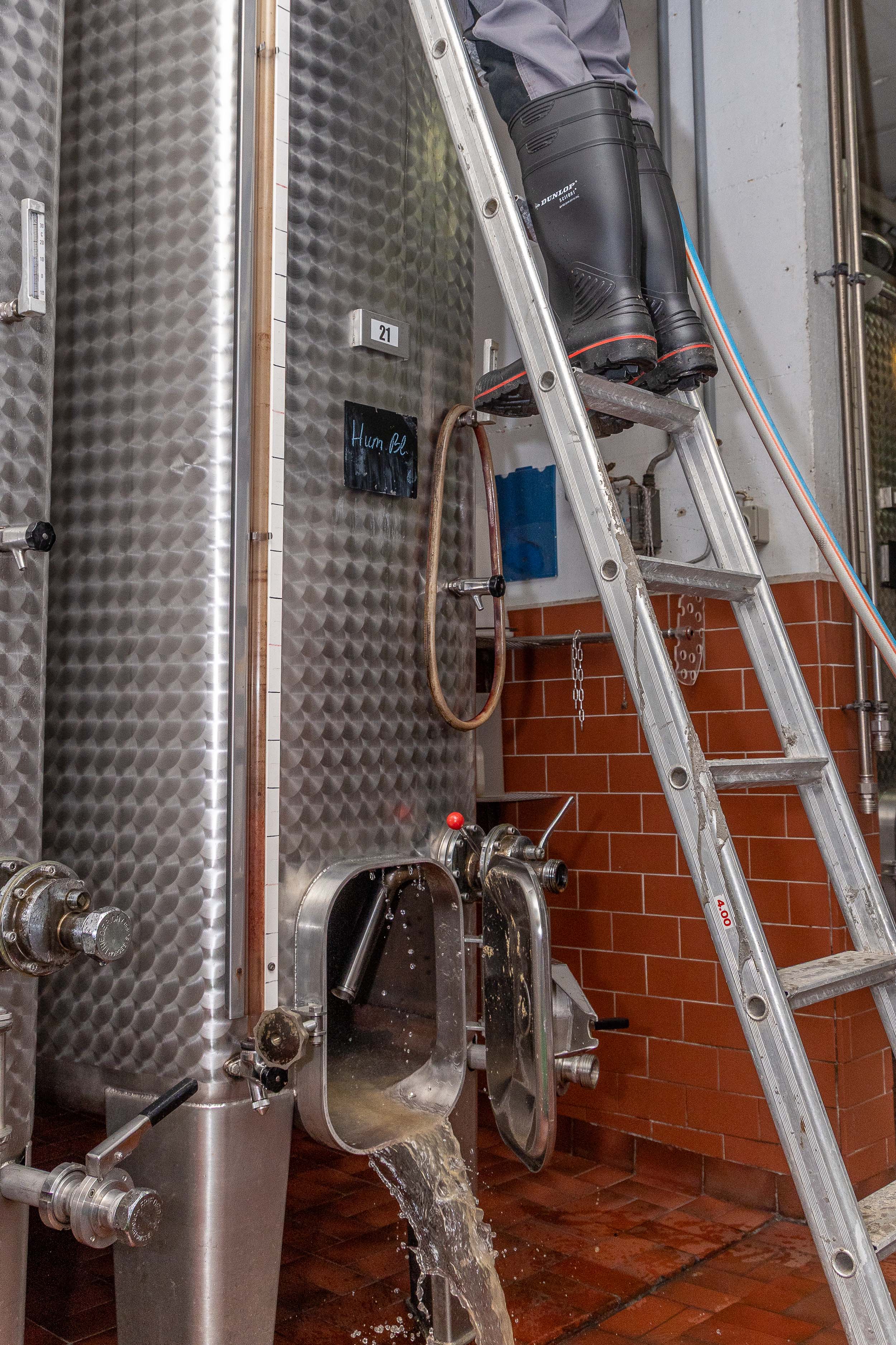 « Nous vidons et nettoyons les dernières cuves pour faire place à la Petite Arvine et au Johannisberg que nous allons encaver aujourd’hui », explique Eddy, dans le vacarme ambiant.