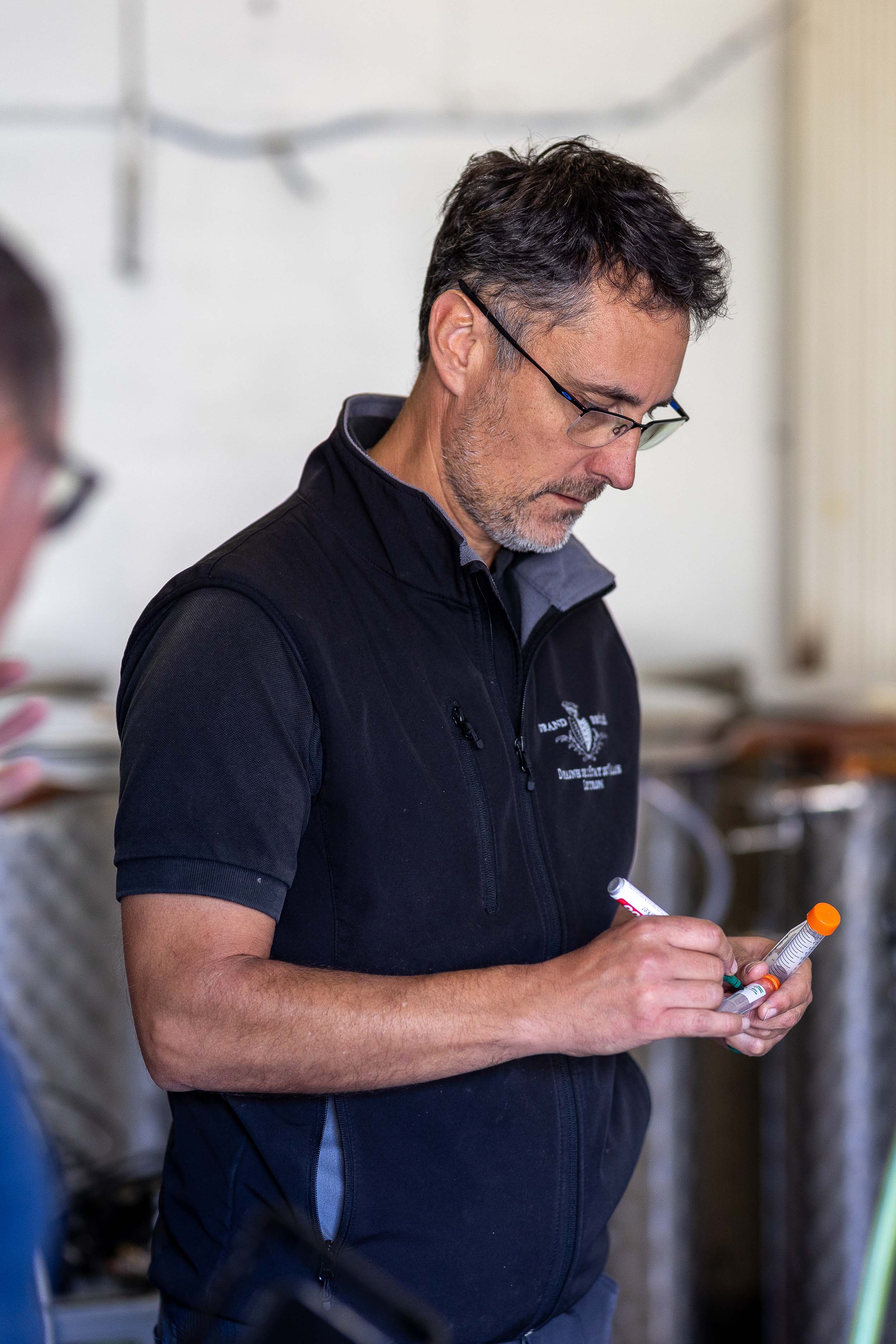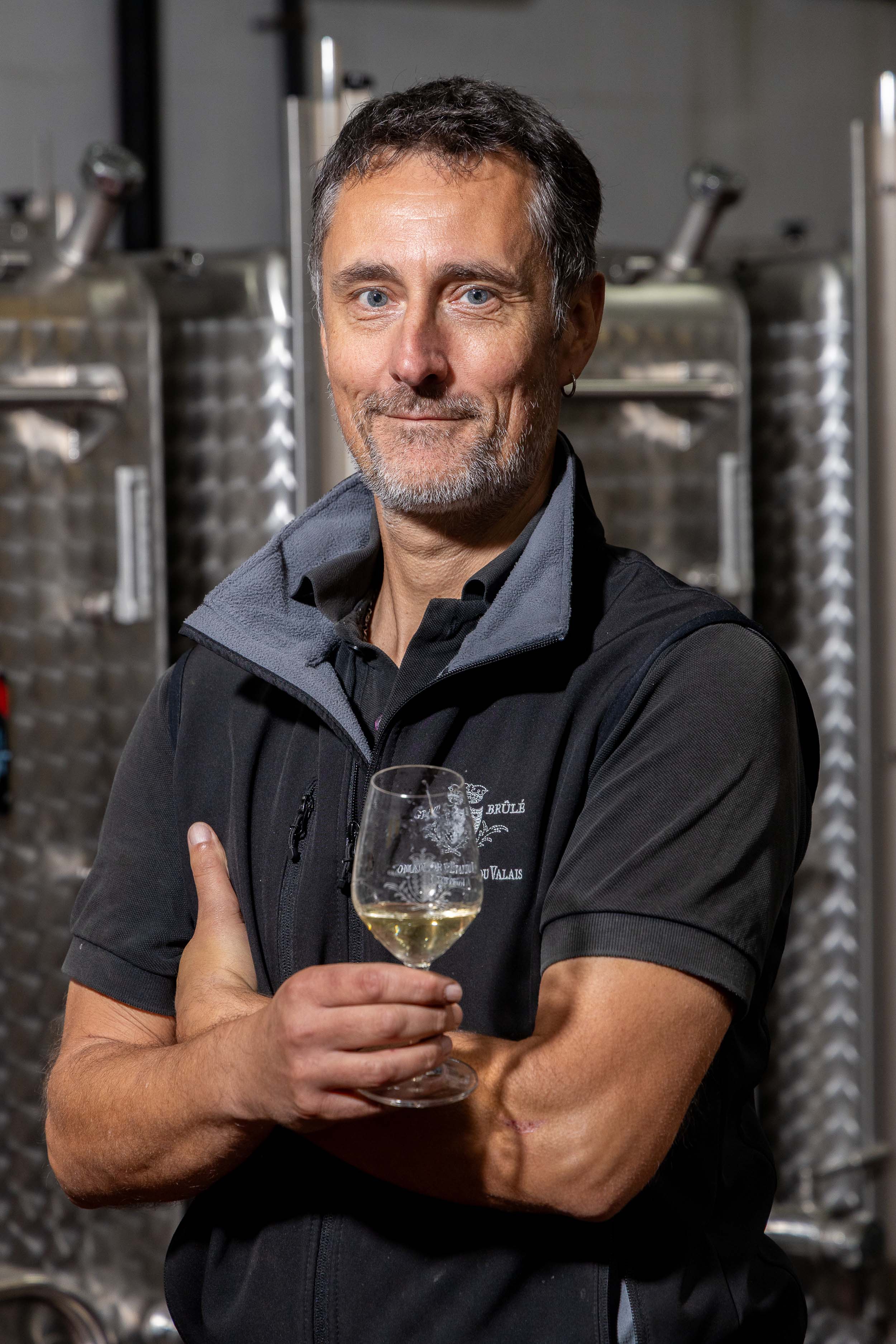 Unique maître caviste de l’Etat du Valais, Eddy Dorsaz vinifie les deux domaines du Grand Brûlé et de Châteauneuf, soit 15 hectares de vignes. Tous les vins - 32 crus au total - sont élevés ici, à Leytron. L’établissement produit en moyenne 70'000 bouteilles par an. « Le maître caviste a un statut de responsable d’entreprise : il réceptionne le raisin, le transforme, l’élève, le met en bouteille et commercialise le produit fini », résume Eddy.