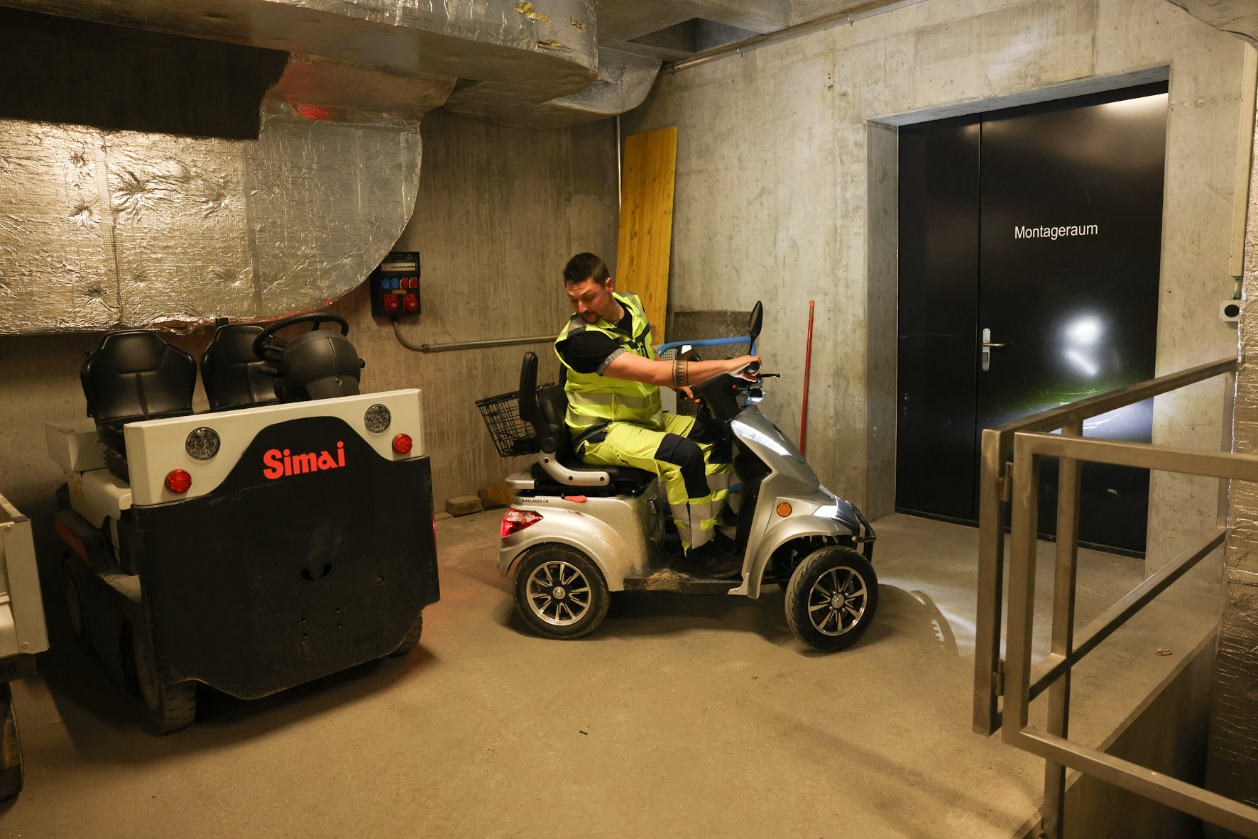 Lors de ses interventions, Jérémy circule en navette électrique dans une galerie technique qui suit l’autoroute, juste sous la chaussée. « A 8 km/h, il me faut tout de même 20 à 25 minutes pour traverser le tunnel de Viège. » Et même s’il voit rarement la lumière du jour, il y trouve son confort : « La température varie entre 12 et 17 degrés, c’est parfait, surtout en été », sourit-il.