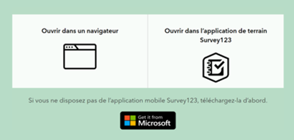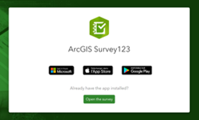Sie haben zwei Möglichkeiten: die erste führt Sie über Ihren Internetbrowser zum Formular (links) (Abb. 1), die zweite (rechts) leitet Sie auf die Seite der ArcGIS Survey123-Anwendung weiter und bietet Ihnen die Möglichkeit, die Anwendung über Microsoft, App Store oder Google Play herunterzuladen. Letztere hat den Vorteil, dass die Anwendung stets auf Ihrem Mobiltelefon präsent ist und Sie rasch eine Meldung machen können, wenn Sie unterwegs sind.