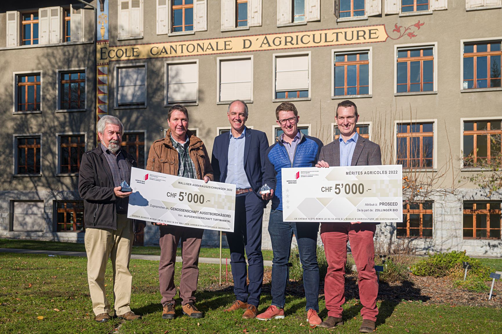 De gauche à droite: René Bregy et Stefan Guntern (Alpgenossenschaft Turtmanntal), le Conseiller d'Etat Christophe Darbellay, Tizian et Til Zollinger