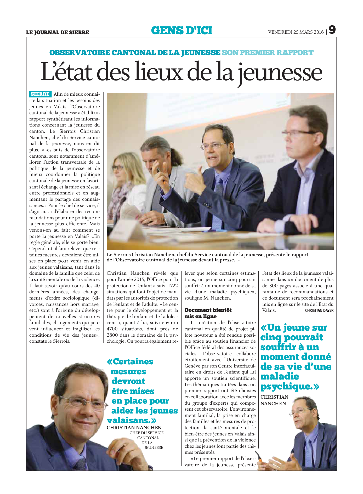 Le 15 mars 2016, une conférence de presse a eu lieu à Sion afin de présenter le premier rapport annuel de l'Observatoire cantonal de la jeunesse.