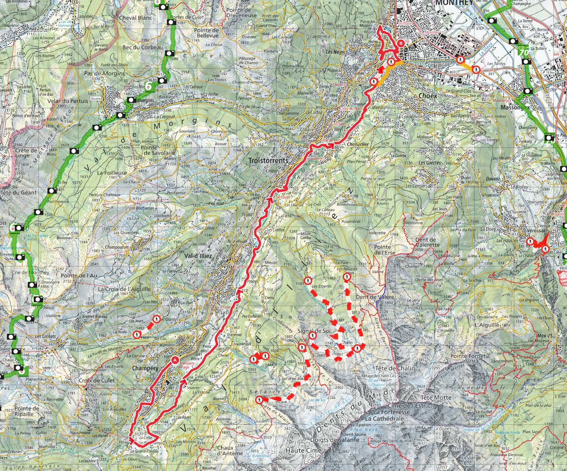 Ce parcours suit le chemin de l'eau depuis Champéry jusqu'à Monthey, en longeant la rivière La Vièze. Sur environ 21 km, cette randonnée invite à découvrir les multiples facettes de l'eau, véritable source de vie. Elle permet aussi de sensibiliser à l'importance de sa préservation, de sa gestion et de son rôle essentiel dans l'environnement local.