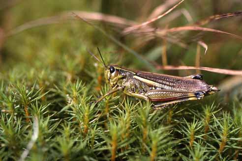 Parmi les rares espèces recensées figure le criquet ensanglanté, en photo ci-contre, qui s’est accommodé pour son régime alimentaire de la coriacité des tiges et de feuilles qu’il y trouve. Ses populations sont toutefois en régression, en corrélation avec la disparition des surfaces de marais dans l’arc alpin.