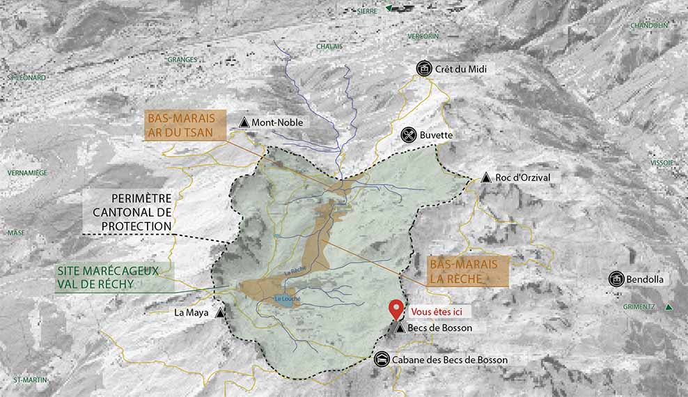 les marais et les sites marécageux d’une beauté particulière, présentant un intérêt national. C’est le cas respectivement des bas-marais de l'Ar du Tsan et de La Rèche ainsi que du haut du vallon de Réchy. Depuis 2015, une décision de protection cantonale permet de préciser les objectifs de protection et les règles à respecter.