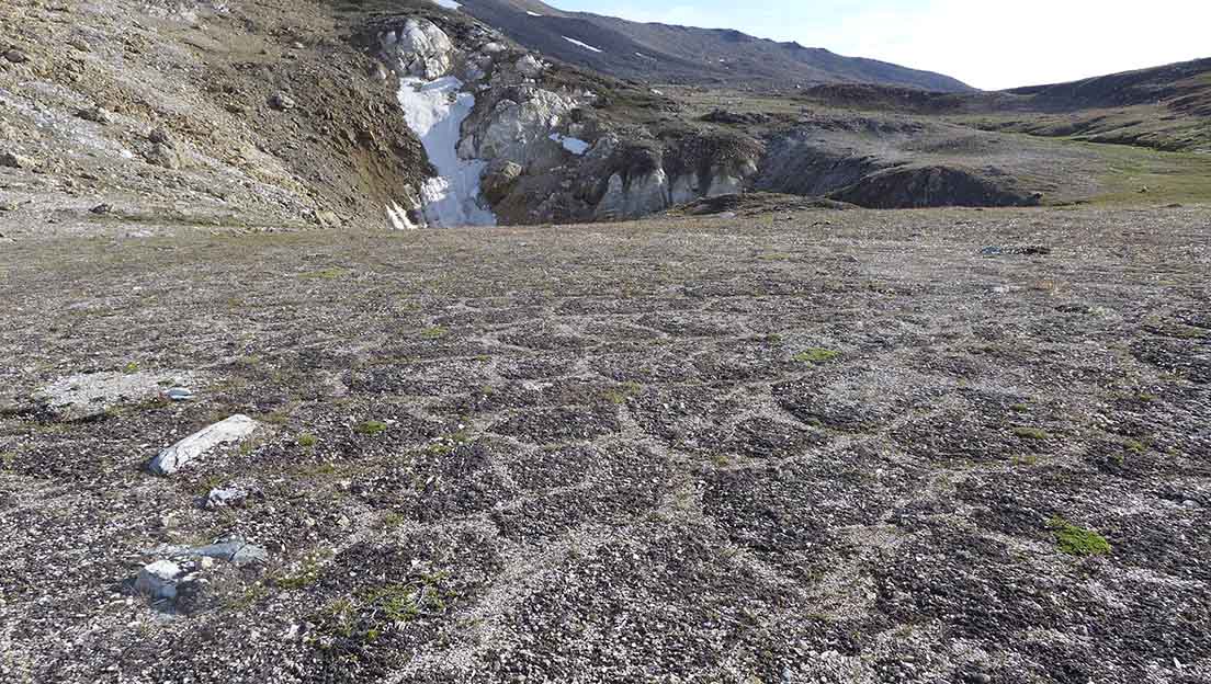 Les sols polygonaux (voir photo ci-contre) sont une manifestation étonnante de l’action du gel-dégel sur des sols plats peu végétalisés. Saurez-vous les repérer sur les derniers replats tout en haut du vallon ?
