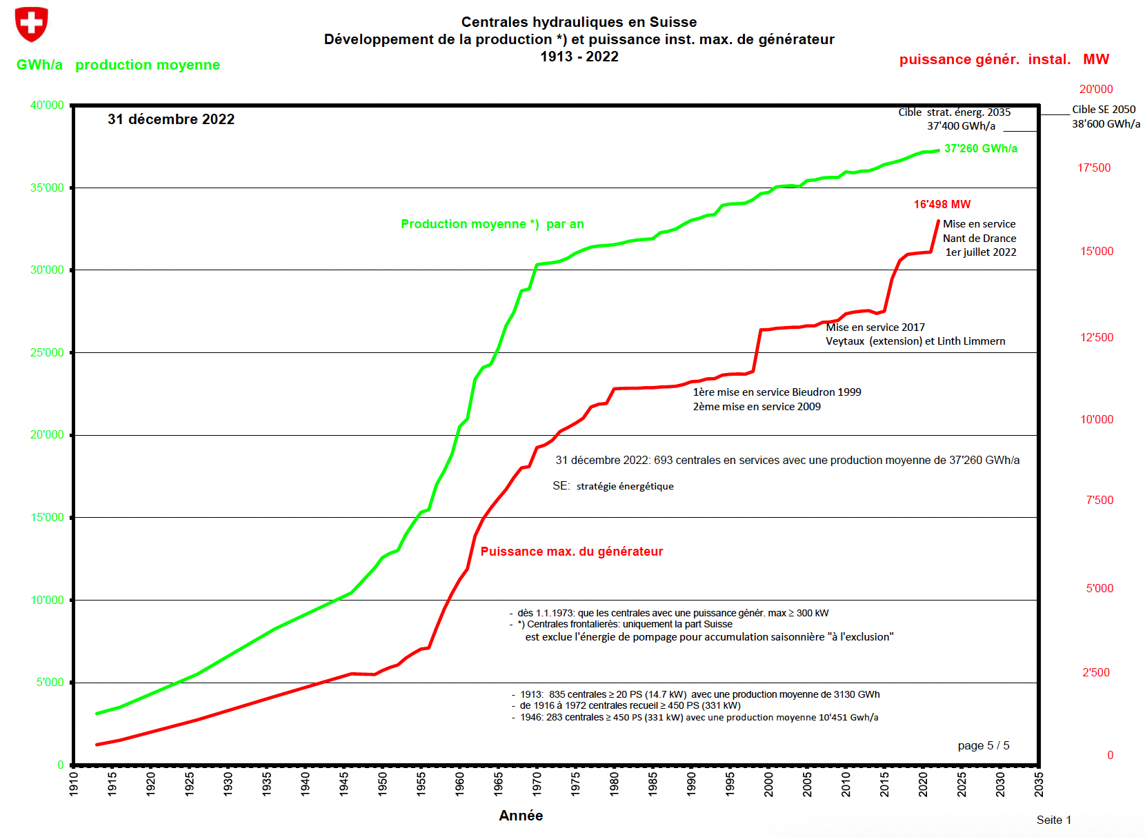 Wasserkraftanlagen der Schweiz – Entwicklung der Produktion von 1913 bis 2022. Quelle: bfe.admin.ch.