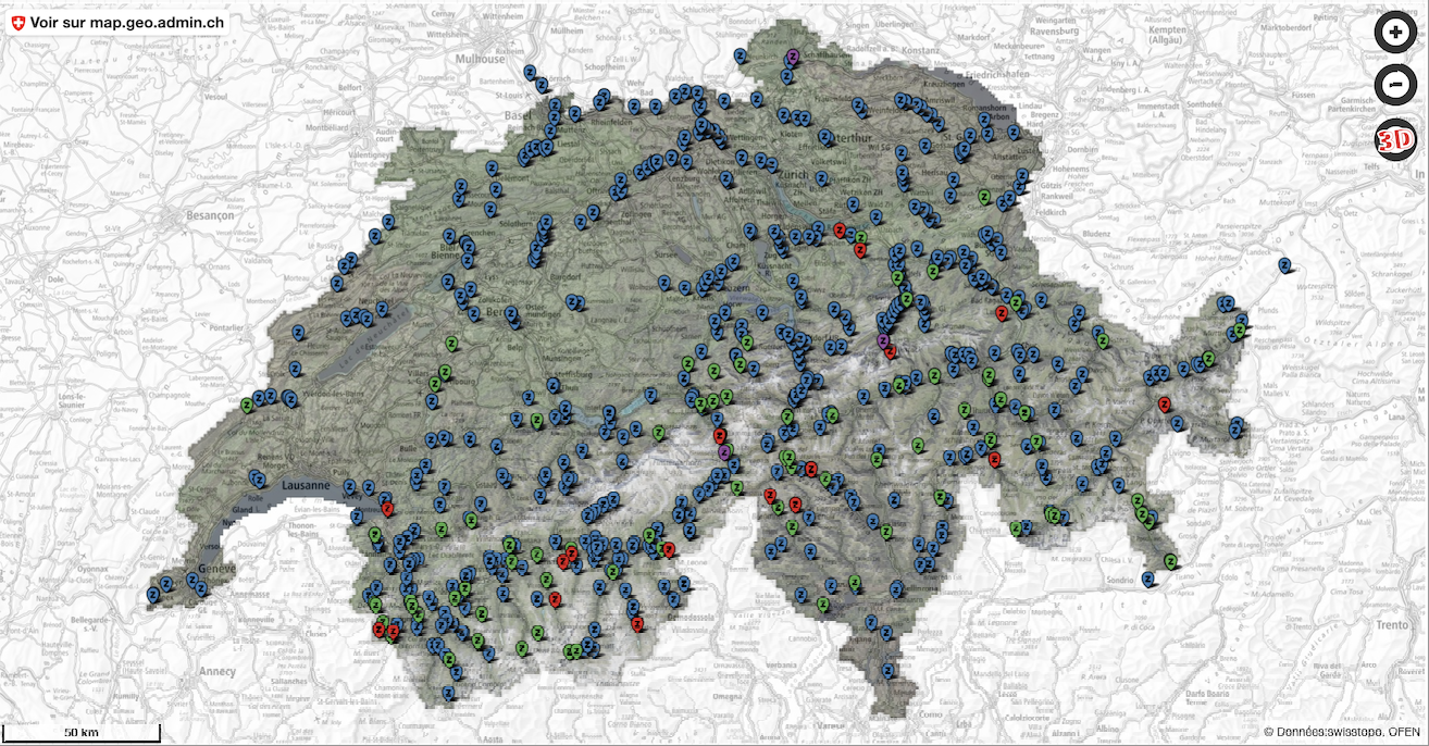 Ansicht der in der Datenbank BDFGeotherm erfassten geothermischen Standorte. Quelle: CREGE, Universität Neuenburg.