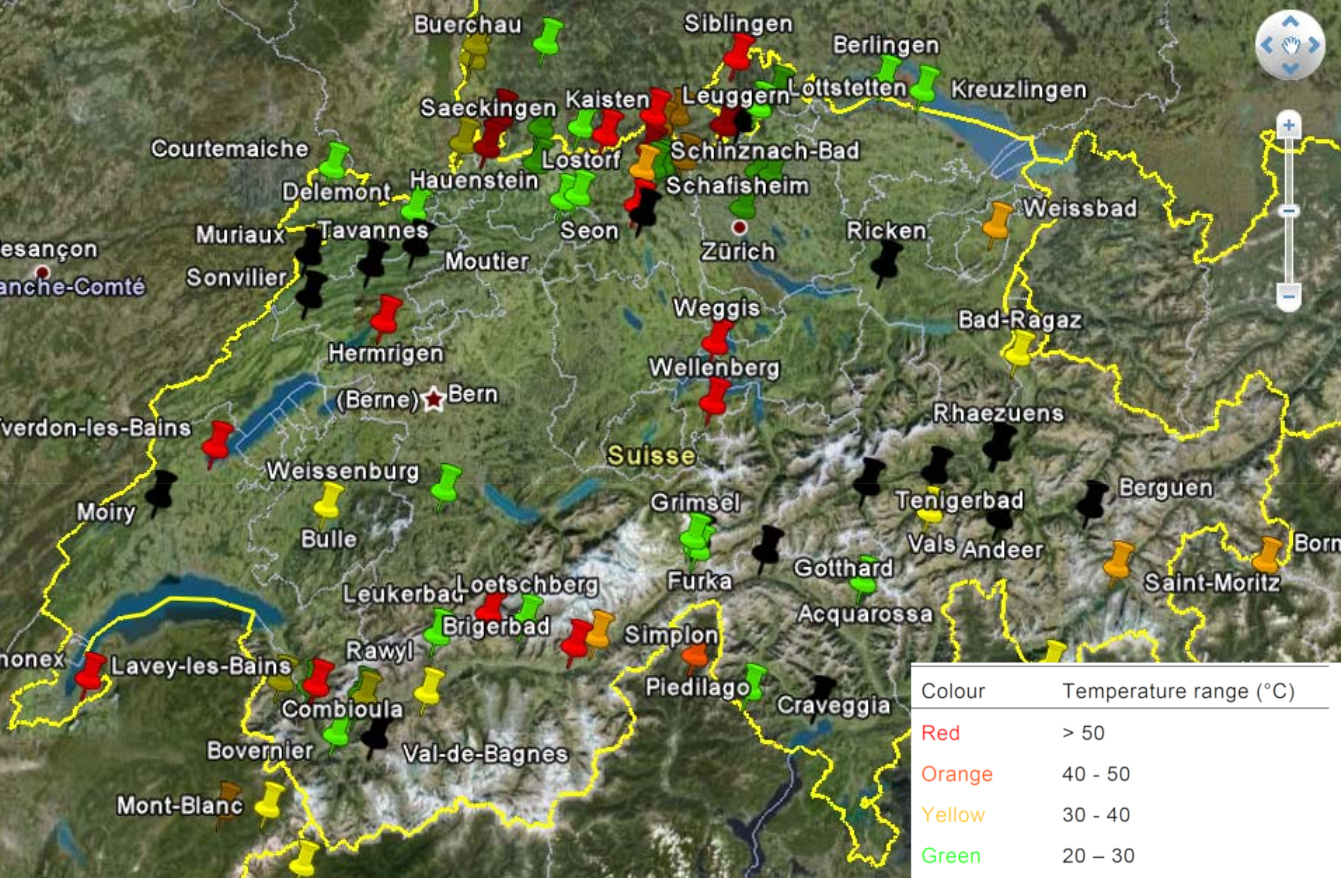 In der Datenbank BDFGeotherm für geothermische "Fluids" (Wasser) sollen die vorhandenen, aber oft verstreuten und nur schwer erhältlichen Daten gesammelt und leicht zugänglich gemacht werden. Insgesamt sind in der Datenbank 84 Standorte erfasst, mit Informationen über die thermischen Fluids, die in nachstender Karte eingezeichnet sind; 12 dieser Standorte befinden sich im Wallis (Quelle: CREGE).