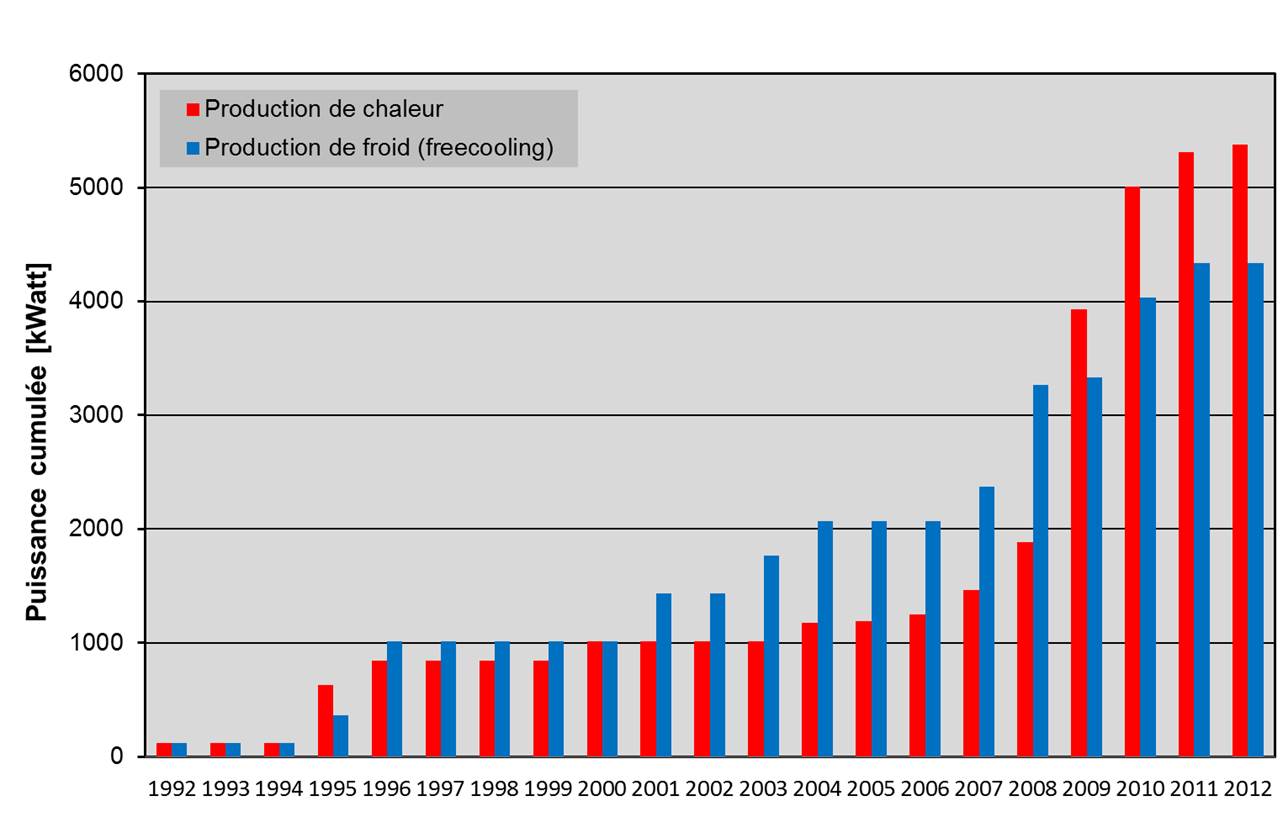 Die nachstehende Grafik zeigt die Entwicklung der aus dem Rhone-Grundwasser bei Sitten erzeugten kumulierten Leistung. Schon ab den 2000er Jahren wurden zahlreiche geothermische Doubletten eingelassen, wobei man mit den meisten Projekten Kälte produzieren wollte (freecooling). Doubletten für die Wärmegewinnung erhielten dann ab 2003, mit Einführung der Minergie- und Minergie-P-Labels, einen starken Aufschwung (Quelle: Geothermie-Schweiz).