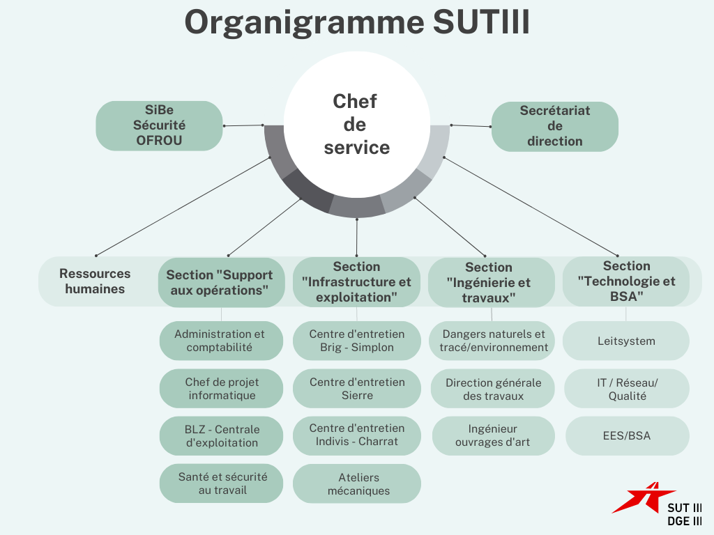 La direction du Service est basée à Martigny. Le SUT III est composé de quatre sections :